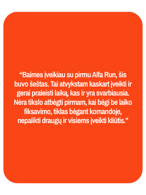 Alfa Run kliūtys pareikalaus ne tik ištvermės. Įveikiant trasą teks ištiesti ranką ir pagelbėti kitam, žengti drauge. Tokios patirtys sukuria tvirtą komandinę dvasią, lydinčią dar ilgai.